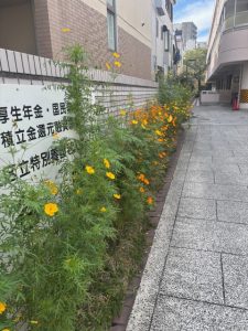 やなかホームの入り口の、黄色やオレンジ色の「コスモス」が見ごろとなっています。