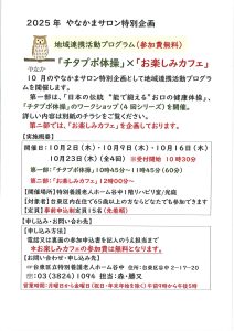 10月は、やなかまサロン特別企画として、10/2から。毎週木曜日の10時45分から、「チタプポ体操」と「お楽しみカフェ」を4回シリーズで実施します。